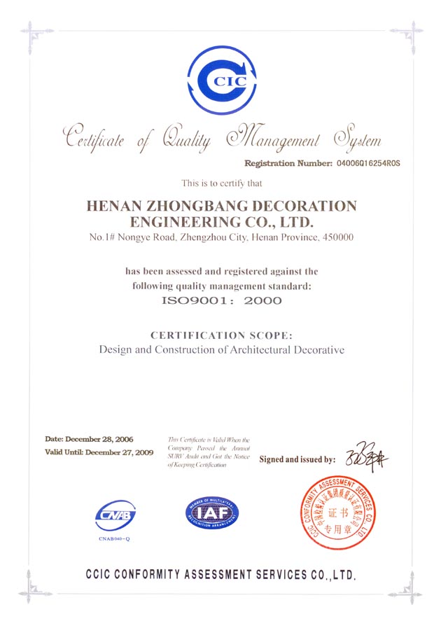 中邦公司于日前顺利通过ISO9001国际质量体系认证。